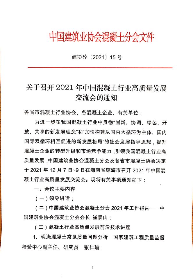 關(guān)于召開2021年中國(guó)混凝土行業(yè)高質(zhì)量發(fā)展交流會(huì)的通知