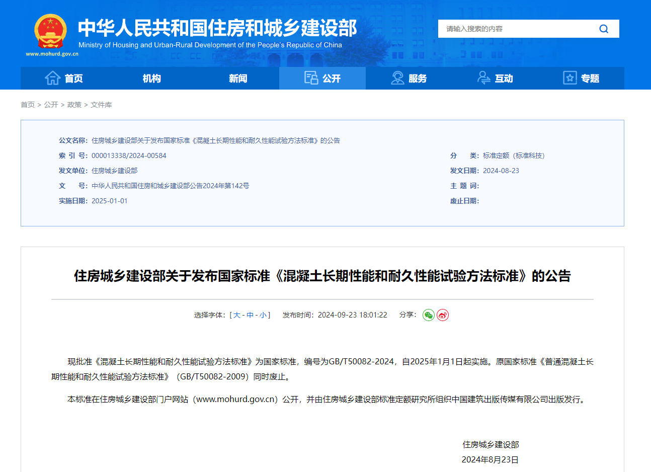 9月23日,住房和城鄉建設部官網發布國家標準《混凝土長期性能和耐久性能試驗方法標準》GB/T50082-2024,自2025年1月1日起實施。原國家標準《普通混凝土長期性能和耐久性能試驗方法標準》(GB/T50082-2009)同時廢止。