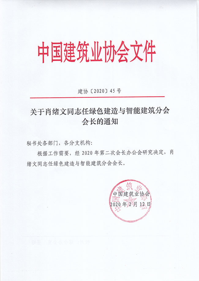 關于肖緒文同志任綠色建造與智能建筑分會會長的通知