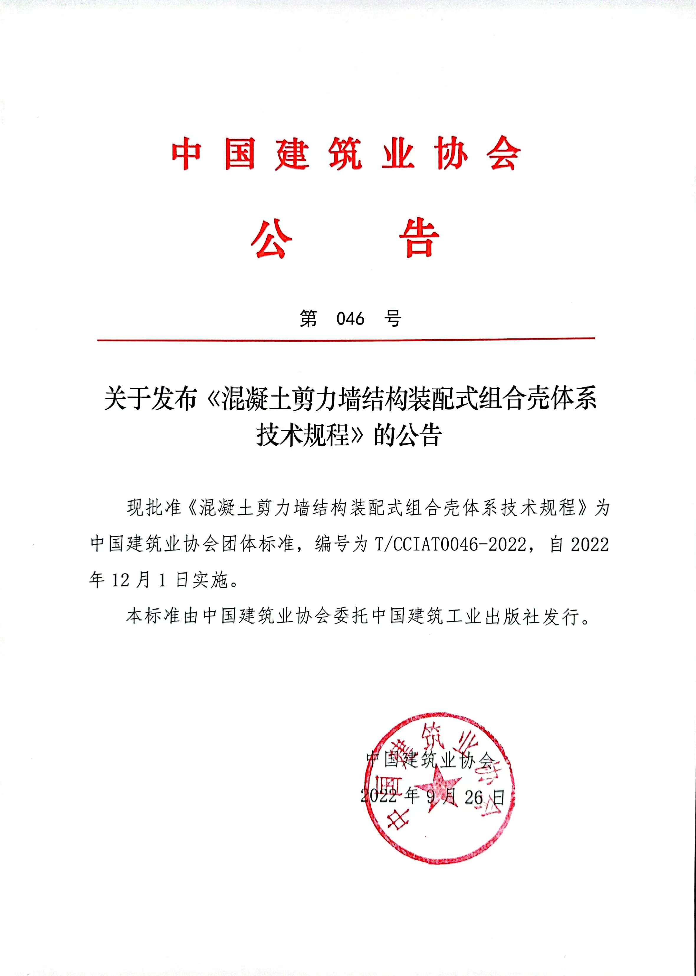 關于發布《混凝土剪力墻結構裝配式組合殼體系技術規程》的公告