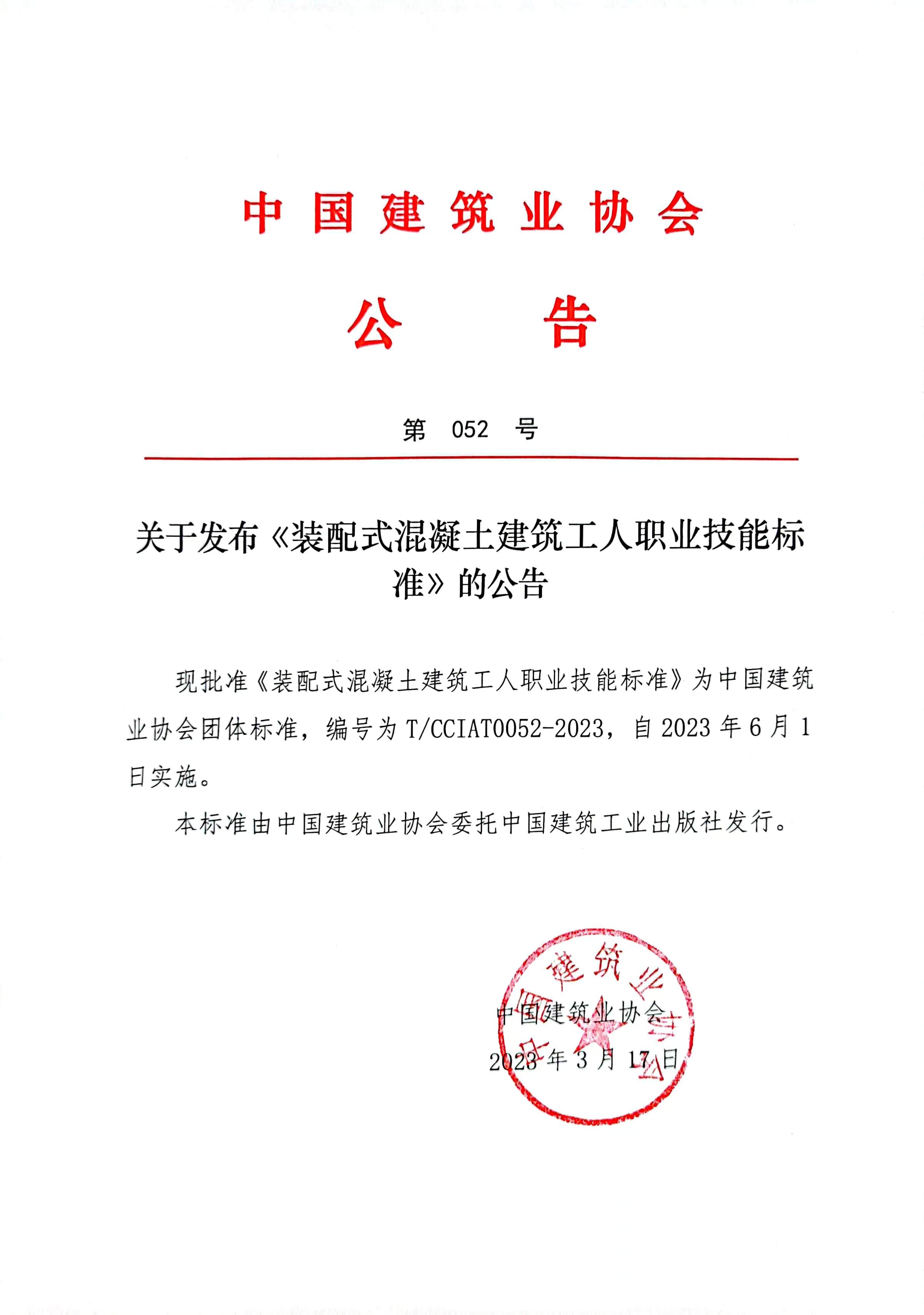 關(guān)于發(fā)布《裝配式混凝土建筑工人職業(yè)技能標(biāo)準(zhǔn)》的公告