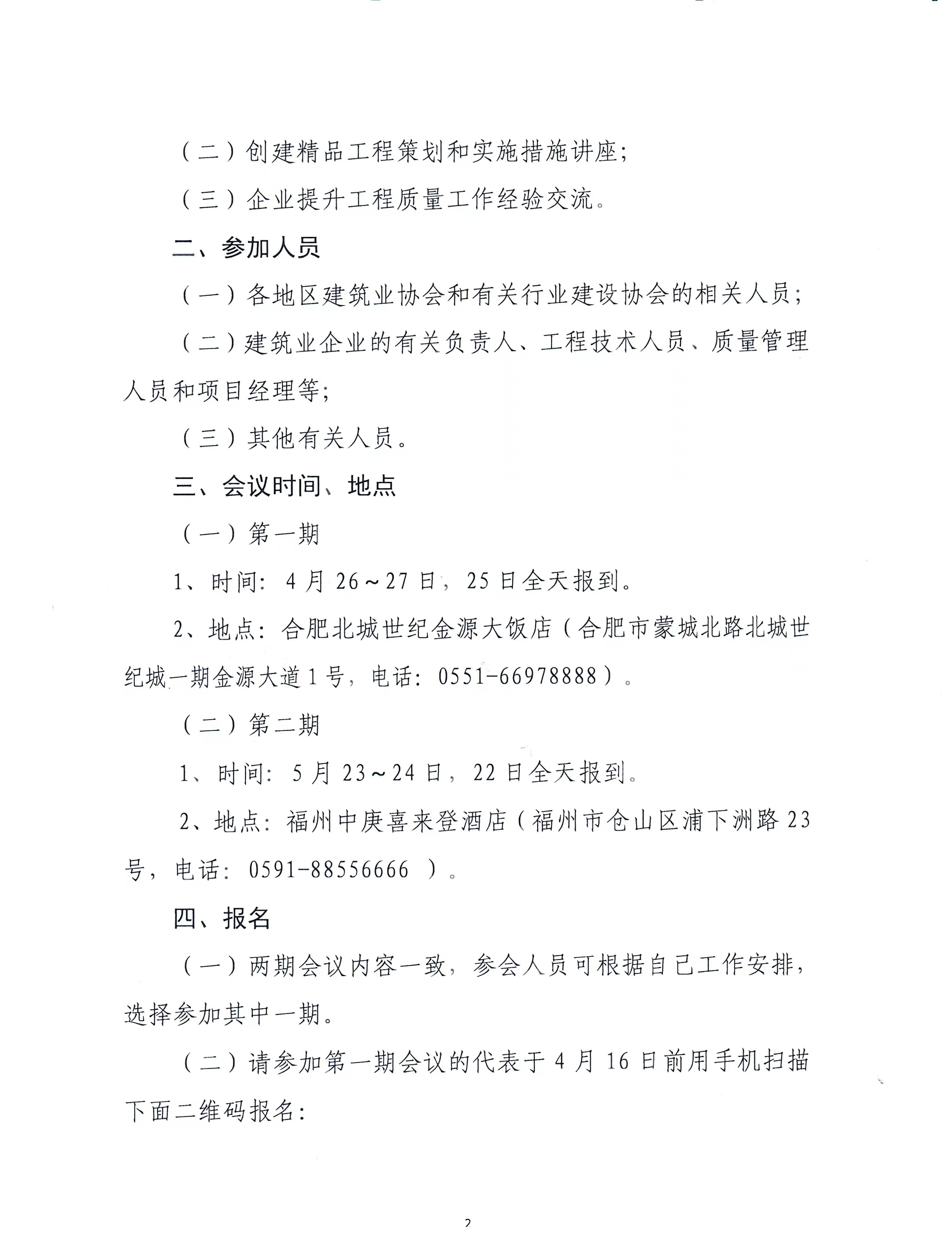 為深入貫徹落實黨的二十大精神和全國住房城鄉建設工作會議精神,推動建筑業企業以建筑業工業化、數字化、綠色化為基礎提升工程建造品質,總結、交流、推廣建筑行業在提升工程質量方面的先進作法和典型經驗,我會定于4月下旬在合肥、5月下旬在福州各舉辦一期全國建筑業企業提升工程質量創建精品工程經驗交流會。(第一期合肥會議已成功召開,第二期福州會議正在積極報名中。)現將有關事項通知如下: