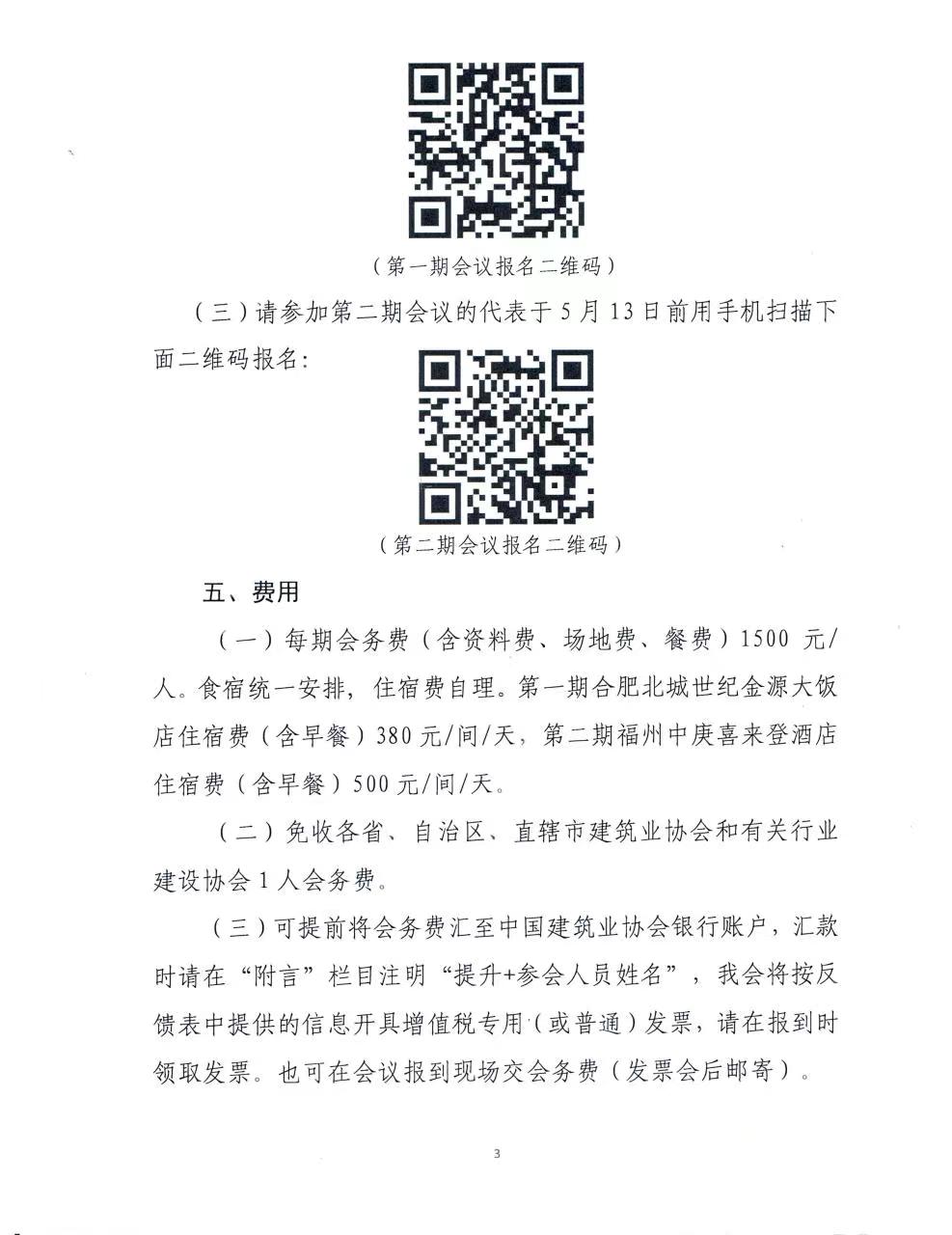 (三)可提前將會務費匯至中國建筑業協會銀行賬戶,匯款時請在“附言”欄目注明“提升+參會人員姓名”,我會將按反饋表中提供的信息開具增值稅專用(或普通)發票,請在報到時領取發票。也可在會議報到現場交會務費(發票會后郵寄)。