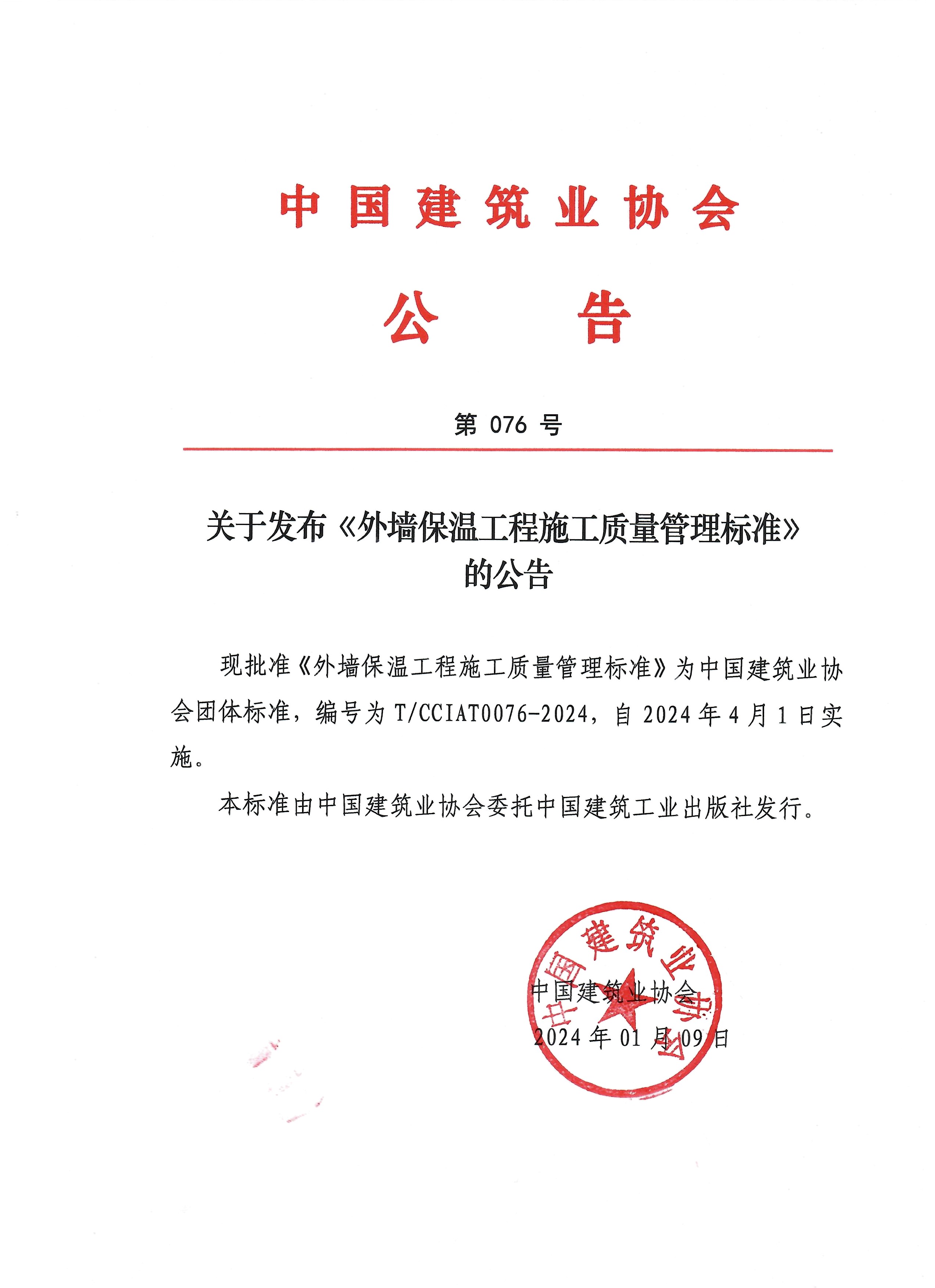 關于發布《外墻保溫工程施工質量管理標準》的公告