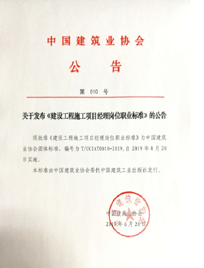 關于發布《建設工程施工項目經理崗位職業標準》的公告
