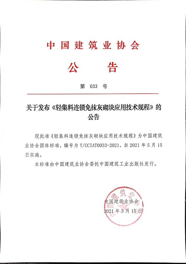 關于發布《輕集料連鎖免抹灰砌塊應用技術規程》的公告