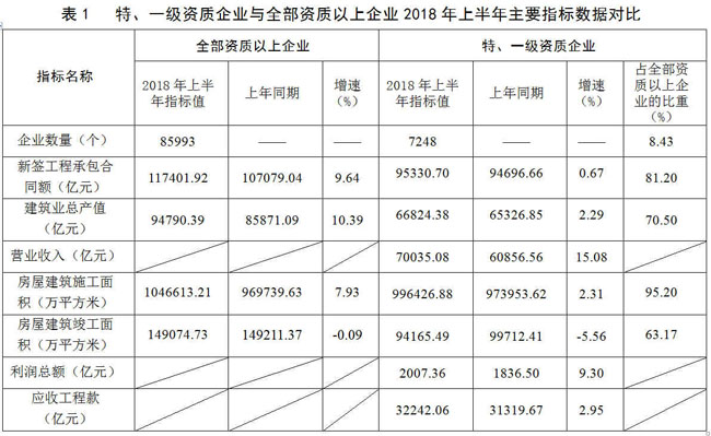 住房和城鄉建設部匯總的7248個特、一級資質建筑業企業2018年上半年主要指標數據如下(表1)。