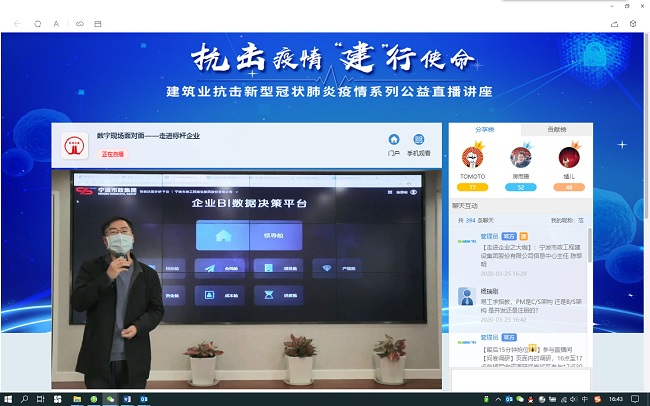 第三期公益直播講座邀請(qǐng)中鐵建設(shè)集團(tuán)有限公司、北京市第三建筑工程有限公司、寧波市政工程建設(shè)集團(tuán)股份有限公司,分別介紹央企、地方國(guó)企、民營(yíng)企業(yè)在疫情期間做好“控疫情”和“促生產(chǎn)”工作情況。