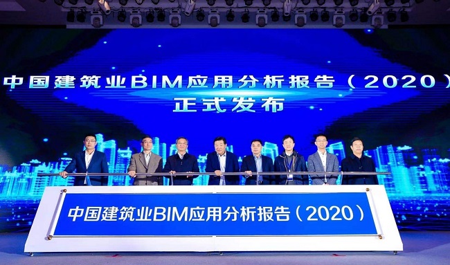 會議舉行了《中國建筑業BIM應用分析報告(2020)》(后簡稱《報告》)的發布儀式。《報告》主編單位領導劉錦章副會長、汪少山副總裁為參會單位代表進行了贈書。