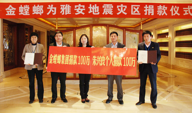 四川雅安地震發生后,金螳螂控股有限公司董事長朱興良倡議集團為災區捐款。捐款儀式于4月23日舉行,金螳螂集團共募捐200萬元,其中朱興良個人捐款100萬元。全部善款將通過蘇州工業園區慈善總會用于雅安地震災區的恢復重建。