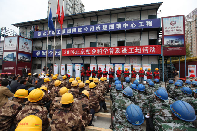 “我們要繼承老一輩為國家富強而奮斗終身的高尚情操和為國家無私奉獻的純潔情懷。愛崗敬業,謹守誠信道德,堅決反對弄虛作假,大力營造善于合作、平等尊重、誠信為本、寬容待人的濃厚氛圍,誠實做人、守信做事。以高度的責任感和使命感,提高文化自覺,堅定文化自信,做培育和踐行社會主義核心價值觀的表率。”10月21日上午,在北京建工四建公司國瑞中心工地施工現場,來自該項目經理部的代表付鵬面對百余名外來務工人員正式宣讀“弘揚中華傳統文化,培育和踐行社會主義核心價值觀倡議書”,這也是此次北京社科聯攜手北京建工四建公司開展2014社科普及周之——社科進工地活動內容之一。北京市社科聯副巡視員王彥京、社科普及部主任張楠、北京建工集團副總經理蘭慧賓、黨委常委宣傳部長俞振江,公司黨委書記張慶澤出席活動,活動由公司黨委副書記、工會主席劉春生主持。四建公司京內各單位黨支部書記、團支部書記、公司總部相關部室負責人以及國瑞中心項目部管理人員和外施工人代表等200余人參加。