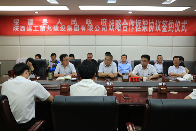 5月25日夜間,陜建九建集團與綏德縣攜手在政府會議室舉行了戰(zhàn)略合作協(xié)議簽約儀式。綏德縣縣長姬躍飛出席主持,并與九建集團董事長賀國健分別代表雙方簽約。綏德縣副縣長張永彬、政協(xié)副主席趙青、物流園區(qū)管委會主任劉漢君、縣政府黨組成員薛士會及集團總經(jīng)理牛新會等領(lǐng)導(dǎo)出席簽約儀式。