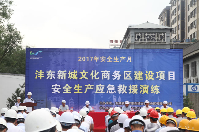 6月30日上午九時許,灃東新城文化商務區建設項目安全生產應急救援演練現場觀摩會在陜建九建集團五公司東西里商業項目部正式拉開帷幕。