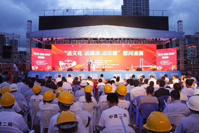 該活動由中建二局西南分公司和中建二局投資公司聯合舉辦,活動除了精彩的文藝表演之外,還為六盤水市一線建設者發放了電子書卡以及牙膏、牙刷、毛巾等日常用品。參會領導為六盤水管廊項目各工區農民工安全督察隊授旗并頒發活動資金,同時表彰了勞動競賽先進單位。