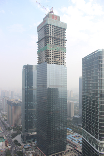 國瑞•西安金融中心項目位于西安高新區CBD核心區域,建筑總高度350米,總建筑面積約29萬平方米。地上塔樓共75層,商業裙房共3層。工程基礎部分結構為筏板樁基礎,主體部分結構為勁鋼框筒。裙房采用框架剪力墻結構,頂層為鋼框架結構,塔樓與裙樓之間設有一座鋼連橋。該工程集金融辦公、文化科技、商務休閑等多項功能于一體,建成后刷新西北超高層記錄,將成為整個西北地區全新的地標式建筑。該工程于2015年9月正式開工建設,2016年5月全面沖出正負零,2016年11月建設高度突破100米,2017年4月突破200米,8月突破300米。自開工至今,工程施工進度得到了有效保證,這樣一座超高層摩天大樓以磅礴氣勢徐徐升起,到如今傲然挺立,是無數建工人辛勤付出的成果。
