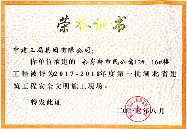 近日,湖北省建設工程質量安全協會傳來喜訊,中建三局二公司基礎設施工程公司襄陽余崗新市民公寓項目12#、16#樓獲得2017年度首批湖北省建筑工程“安全文明施工現場”榮譽稱號。該獎項由湖北省建設工程質量安全協會頒發,是我省建筑安全文明施工的最高獎項。