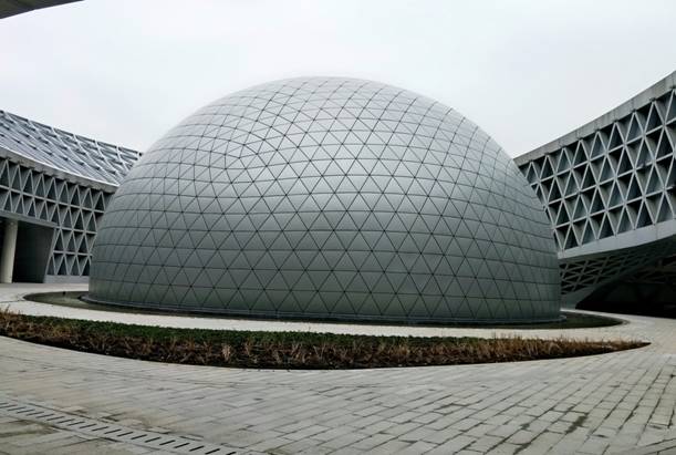 該項目造型獨特,鋼結構包括主體結構、表面斜交網格和球幕網殼,獨特的空間漸變曲面橢圓形屋蓋設計,使科技館新館成為全國最大立面屋面雙向斜交網殼曲面結構工程,在業界素有“小鳥巢”之稱。