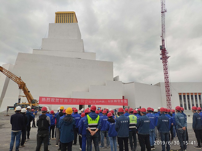 6月30日,隨著甘南文旅會展中心金頂真容乍現(xiàn),項目部全體人員歡欣鼓舞——經(jīng)過100天奮戰(zhàn),甘肅建投一諾千金,主場館項目A區(qū)、E區(qū)在 6月30日如期完工,交付布展,將不可能變?yōu)榱爽F(xiàn)實。