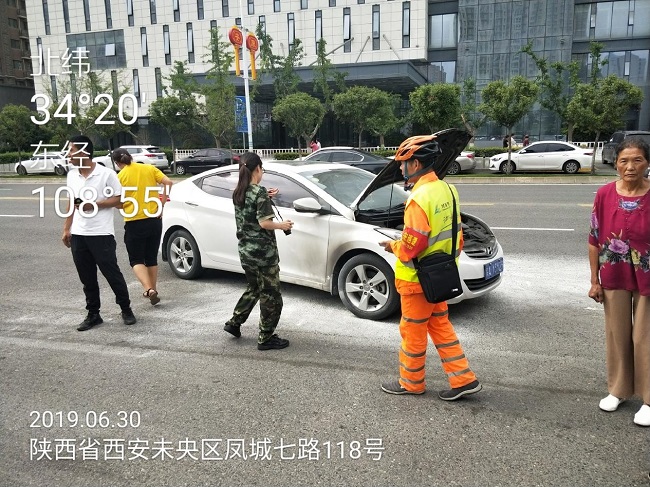 原來6月30日中午,西安35℃的高溫天,雷先生一家老少駕駛私家車行駛到未央區鳳城七路時轎車引擎蓋下突然冒出大量濃煙,雷先生大驚,當即停車查看。剛把引擎蓋揭開,明火就冒了出來。雷先生車上有原車的滅火器,但是關鍵時刻滅火器卻無法正常使用。危急時刻陜西現代農業檢驗檢測預警防控技術中心項目部的王詠、晁洋超、曹東等人看見濃煙后第一時間從項目部取出大滅火器跑向自燃車輛幫助滅火,在他們的努力下火勢得到了控制,明火被及時撲滅。雷先生的轎車雖然引擎蓋下部分部件被燒,但轎車得以保全。隨后,項目部人員看大熱天車上坐著的有老人還有孩子,便安排他們在項目部的休息區域納涼等待救援車,將轎車運至他處修理。