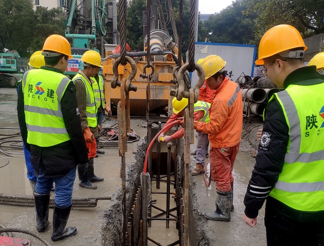 地下分項工程體量大,工期緊,質量要求高。支護、樁基、土方等工程造價已達1億多元,僅連續(xù)墻、樁基、鋼筋砼支撐的鋼材用量就達5000多噸,混凝土用量約為30000多立方米。基坑支護采用兩墻合一地下連續(xù)墻,厚度為1000毫米和800毫米,成槽深度可達50余米,在武漢地區(qū)極為少見。每幅鋼筋籠長達50米(約15層樓高),單幅鋼筋籠重量約52噸。其中地下連續(xù)墻混凝土強度等級為水下C35P10,具有水下不分離、自密實性、低泌水性和緩凝等特點,這對成槽后混凝土限時澆筑要求非常嚴格,且地連墻僅上部28米進行了三軸攪拌樁加固,下部易發(fā)生塌孔。項目部管理人員自行研制了深處泥漿取樣器,更客觀、便捷地檢測了深處泥漿指標,施工過程中未發(fā)生塌孔現象。地下連續(xù)墻原設計74幅,經項目部研究后和設計單位溝通,優(yōu)化為70幅,鋼筋籠兩次吊裝拼接改為一次性整體吊裝。不僅有效保障施工安全也提升了施工效率,節(jié)約建設成本20余萬元,取得雙贏的效果。最終,70幅地連墻歷時122天全部順利完工,比原計劃提前25天。