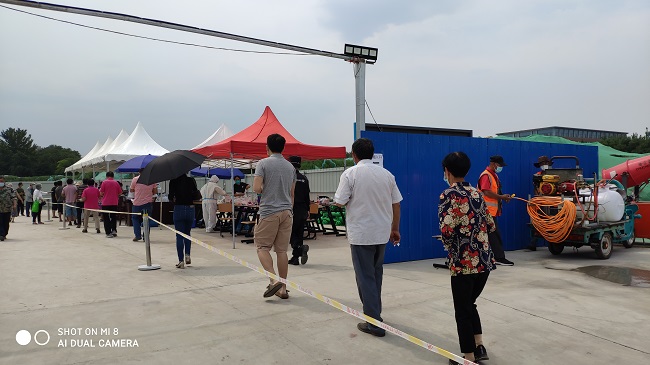 6月18日一早,項目部便派出10名黨員干部協助樊家村村民進行核酸檢測,在現場,項目人員衣著防護服分散在檢測點門口幫助村民掃二維碼進行檢測人員信息登記,在隊伍中間有序組織大家保持一米間隔,以及在檢測地點協助醫生對村民進行核酸檢測。