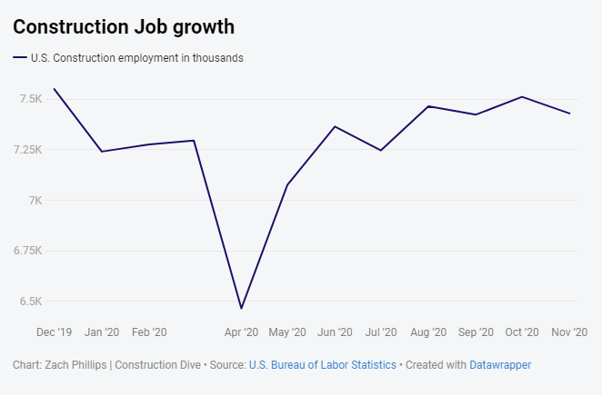 There are a number of reports and outlets that help experts and executives keep their finger on the pulse of the construction industry. Curated by the Construction Dive staff, this page centralizes data from those resources and helps visualize it as a one-stop resource about construction industry spending, hiring, starts and billings. This construction industry data page is updated bimonthly.