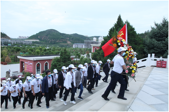 在“四八”革命烈士陵園,建筑工人代表向烈士紀念碑敬獻花籃,在莊嚴肅穆中悼念、緬懷革命先烈,追憶先烈們走過的艱難歷程,從內心領悟到延安精神的光芒和真諦。